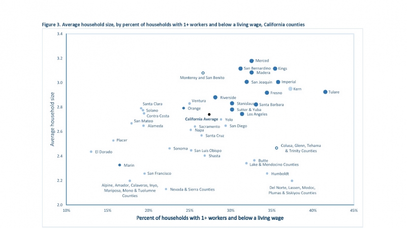 Analysts examined worker distress by considering the percentage of households living below a living wage and the number of people in a household. Fifteen counties that surpassed state averages for both measures were deemed to be high in worker distress.